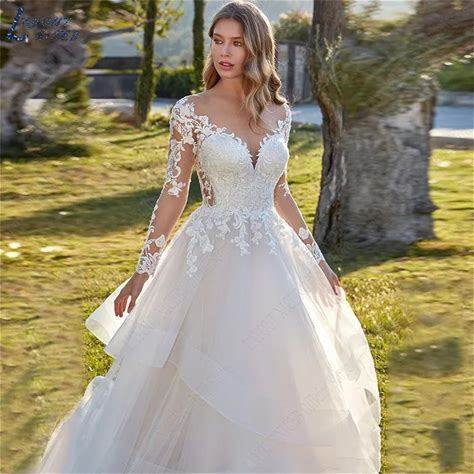 LAYOUT NICEB Princess Tiered Tulle A-Line Wedding Dresses Lace Long Sleeve Ball Gown For Bride